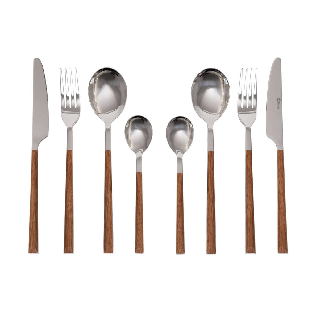 Das 16-teilige Berger Wood Besteckset enthält das komplette Besteckset (4 Messer, Gabeln, Esslöffel und Teelöffel) für 4 Personen. Das Design besticht durch einen Holzakzent – die Griffe haben eine Holzoptik (oder eine holzähnliche Optik), die Ihrem Tisch einen warmen, natürlichen Stil verleiht.