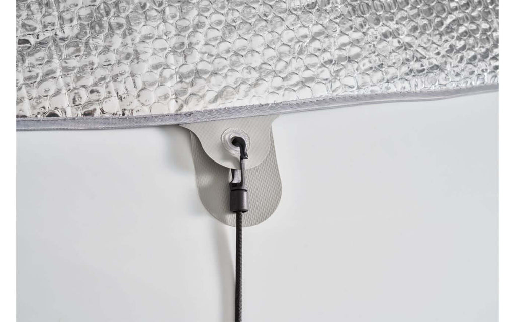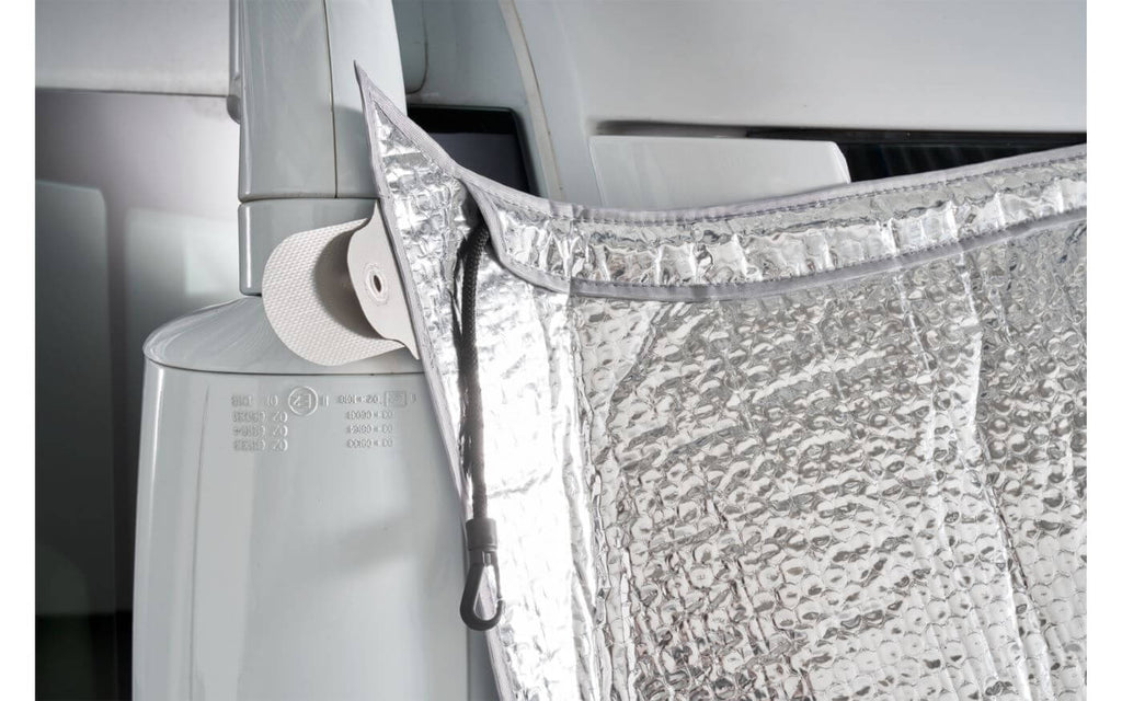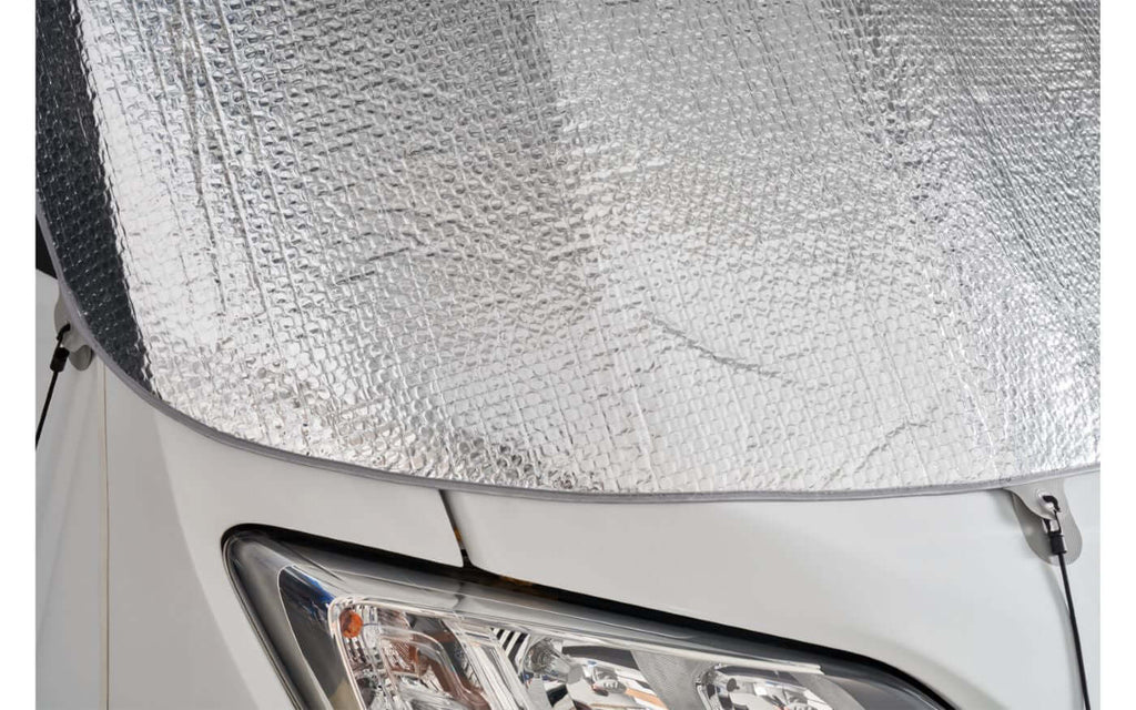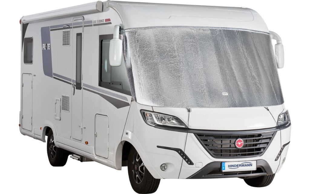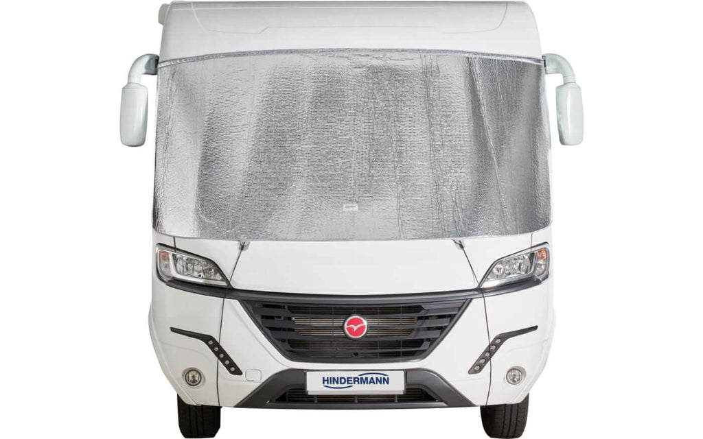 Wärmeisolierter Außensonnenschutz für die Windschutzscheibe von integrierten Wohnmobilen. Hindermann – ein hochwertiger, wärmeisolierter Sonnenschutz, der speziell für integrierte Wohnmobile entwickelt wurde. Dieses Ganzjahresprodukt reagiert effektiv sowohl auf Sommerhitze als auch auf Winterkälte und sorgt für eine stabile Innentemperatur und Schutz des Innenraums.