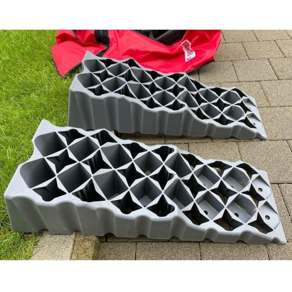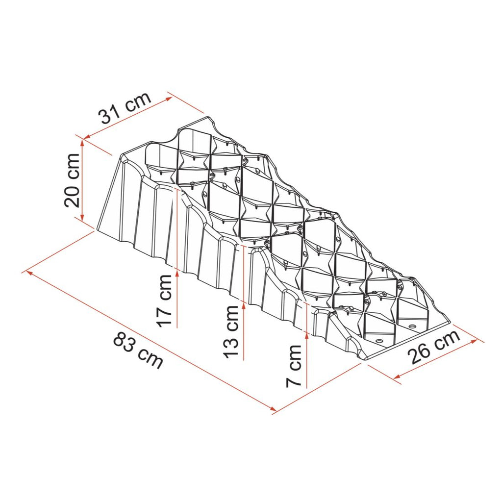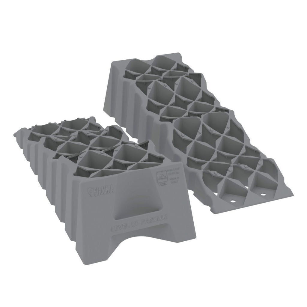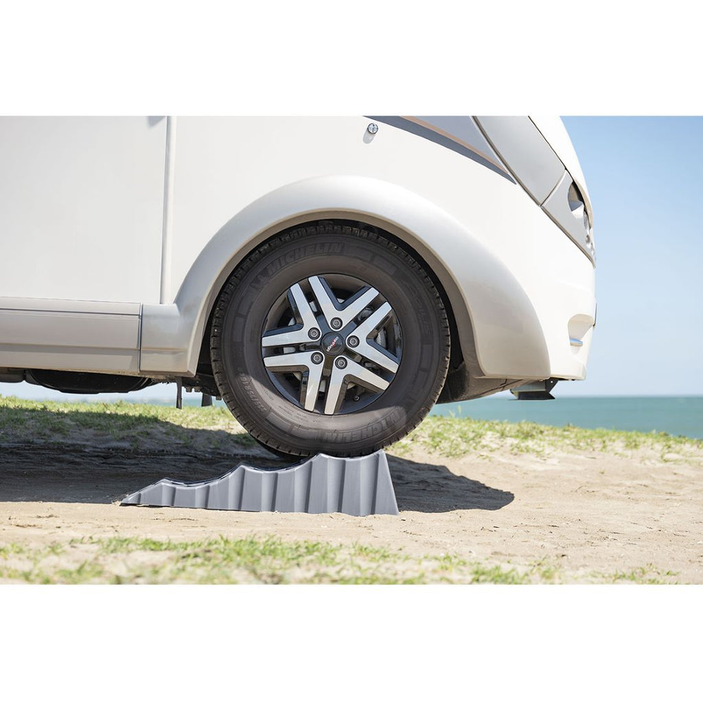 FIAMMA Kit Level Up Premium is a high-end leveling system designed for all types of campers and vans , including heavier campers. The kit is designed for maximum stability, safety and comfort when parking on uneven or unstable terrain. The wedges are made of UV-resistant polymers and are designed to withstand heavy loads.