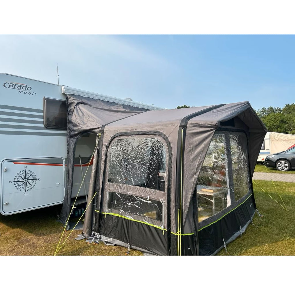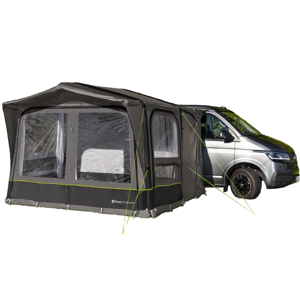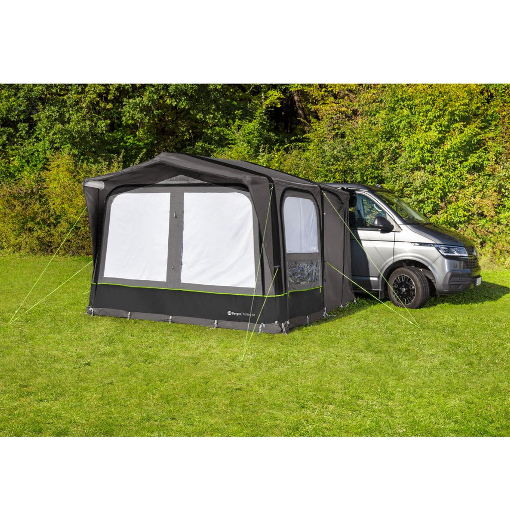 Berger Pontina Air е универсална надуваема палатка-предверие (inflatable awning), създадена за къмпингуване с ван, кемпер или миниван. Тя комбинира бърз монтаж, комфорт и гъвкавост, което я прави подходяща както за почивки на открито, така и за по-дълги пътувания.