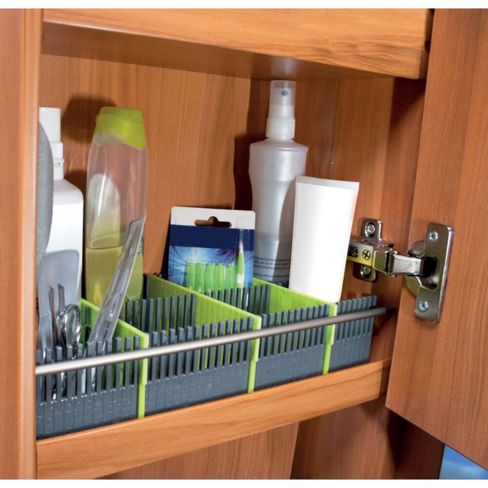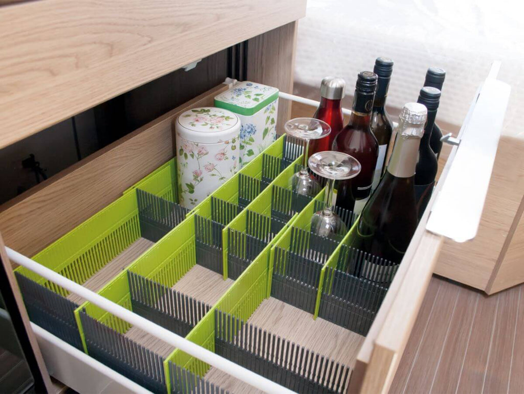 Органайзер Purvario by DÖRR – практично решение за шкафове и чекмеджета в кемпери и каравани. Подреди лесно чаши, чинии и прибори без шум и счупвания по време на път.